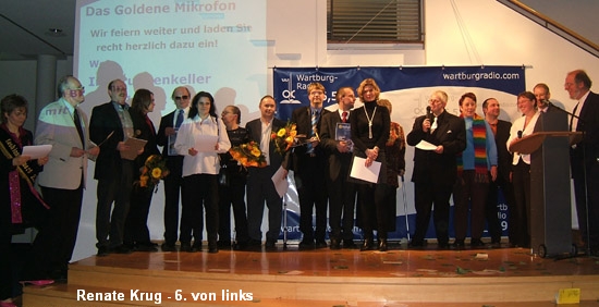 Am 03.03.06 wurde das Goldene Mikrofon für Sendungen des Wartburgradios 96,5 in verschie-denen Kategorien vergeben. Bernd Fischer und Renate Krug haben mit ihrer Sendung, einer gelungenen Mischung von Lyrik aus eigener Feder und Rockmusik, den 2. Platz in der Katego-rie Publikumspreis belegt. An dieser Stelle herzlichen Dank an alle, die für sie voteten.