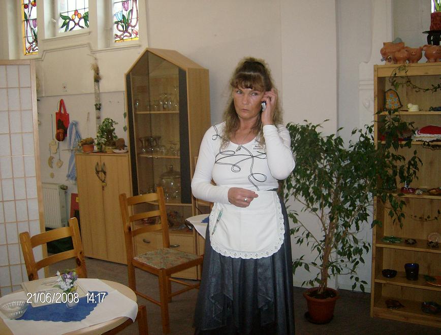 Die Kellnerin ( Petra Ziesemer, von Anfang an dabei ) eröffnet nach einem eiligen Telefonat das Café und bewirtet fachgerecht die Kaffeetanten.